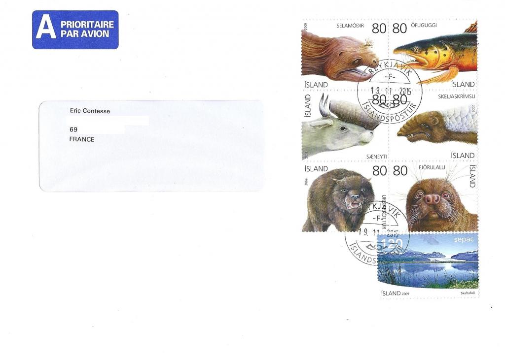 Le timbre Sepac émis par l'Islande cette année (le 19 février 2015) figure en haut à gauche sur la jolie lettre ci-dessous envoyée le 10 novembre 2015 de Reykjavik. Merci beaucoup Emma :-)