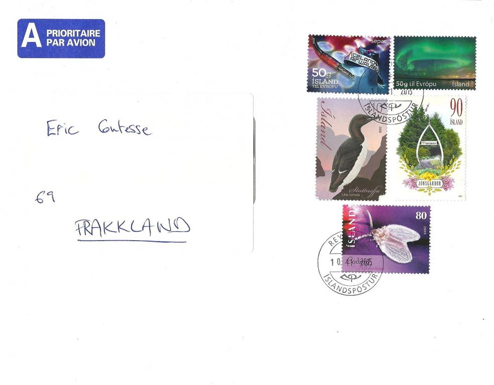6 timbres extraits de ce bloc-feuillet ont été utilisés pour affranchir la lettre de la poste islandaise ci-dessous, envoyée le 19 novembre 2015 de Reykjavik.