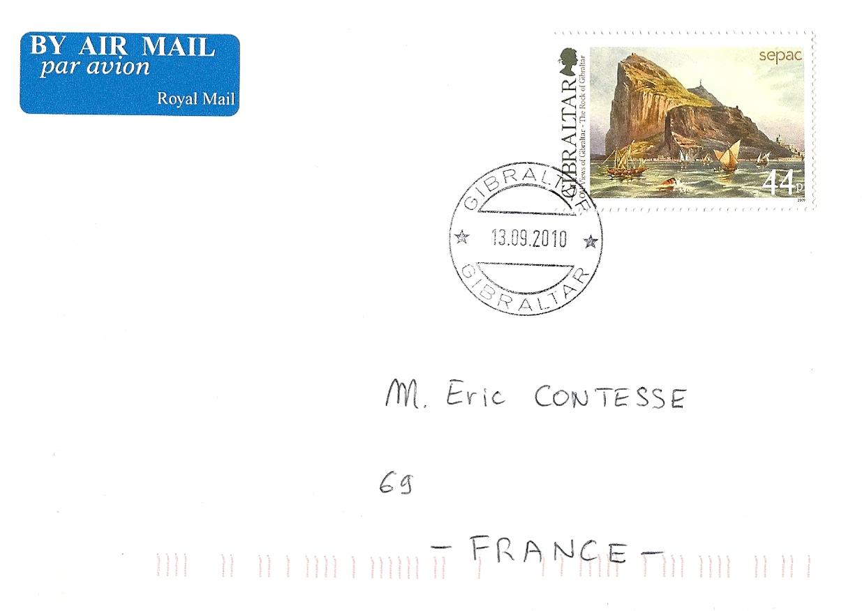 Ce timbre figure sur la lettre ci-dessous posté le 13 septembre 2010, avec une oblitération très nette (mais pourquoi comporte-t-elle deux fois le terme "Gibraltar" ?).