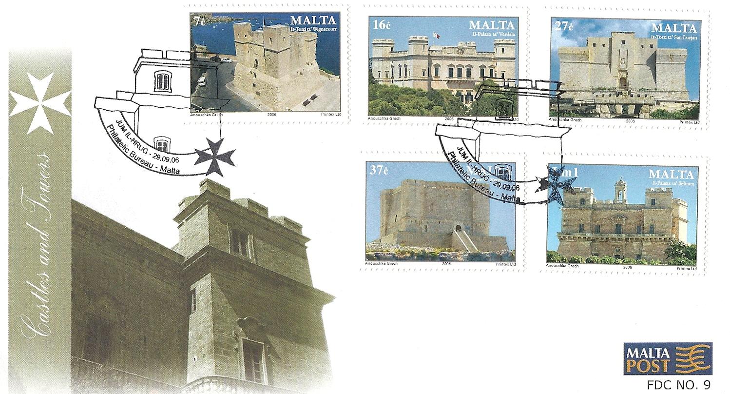 Il y a quelques mois, j'ai reçu en cadeau de la poste maltaise l'intéressant FDC ci-dessus concernant une série de 5 timbres, émis le 29 septembre 2006, consacrée à des tours et châteaux du pays.