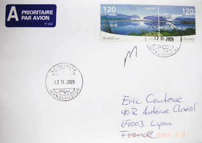 Ces 2 timbres, émis se-tenant le 16 septembre 2009, avec le logo Sepac sur un seul des 2 timbres, figurent sur la lettre ci-dessus postée le 12 novembre 2009 de Reykjavik.