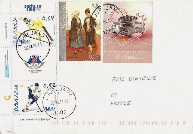 C'est la version slovène de ce timbre (0,64€) qui a été utilisée pour affranchir la jolie lettre ci-dessus, postée le 7 novembre 2014 de Ljubljana. Merci beaucoup Petra :-)