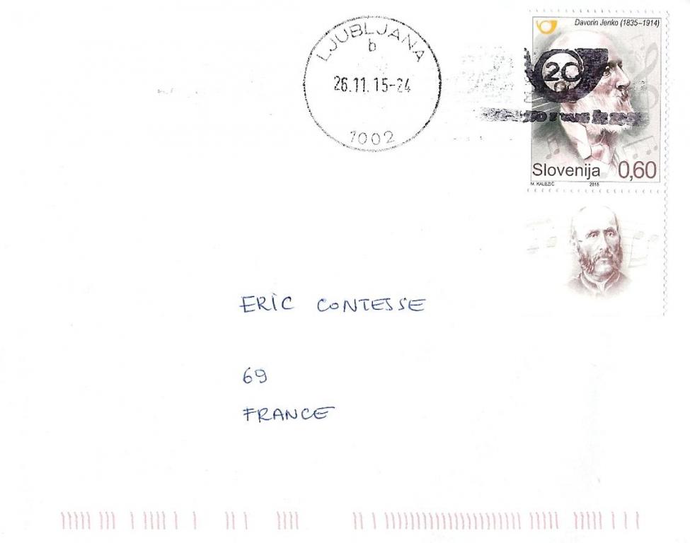 La version slovène de ce timbre (0,60€) figure à gauche sur la jolie lettre ci-dessus, envoyée le 19 juillet 2016 de Ljubljana. Merci beaucoup Petra !
